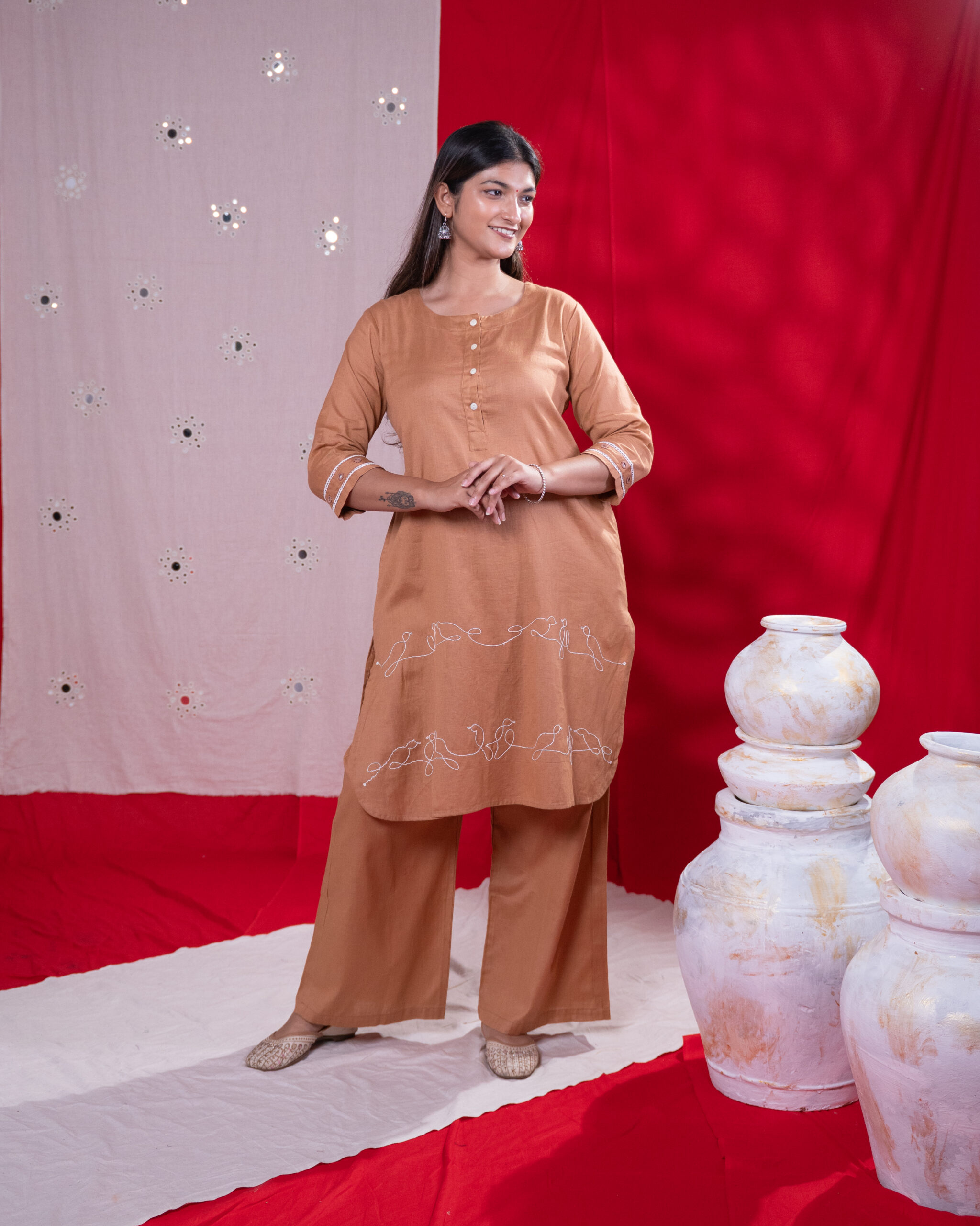 - Round Neck with Hand Embroidery and Button Detail on Front